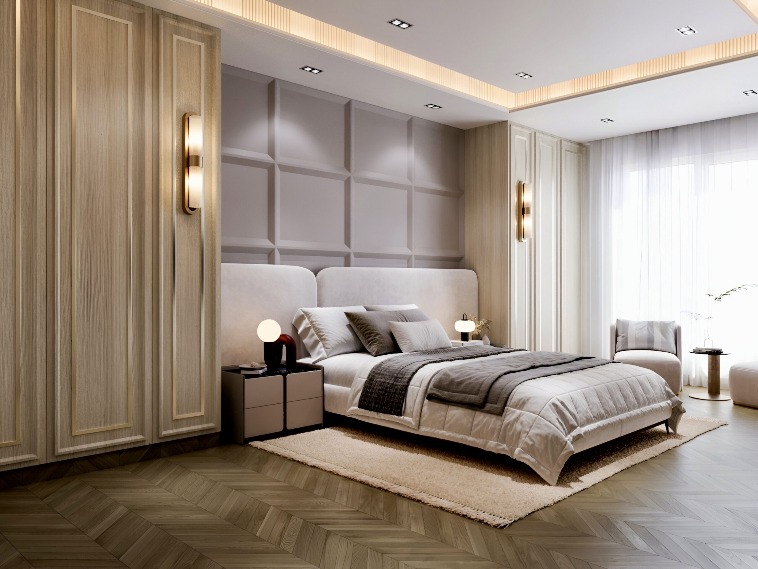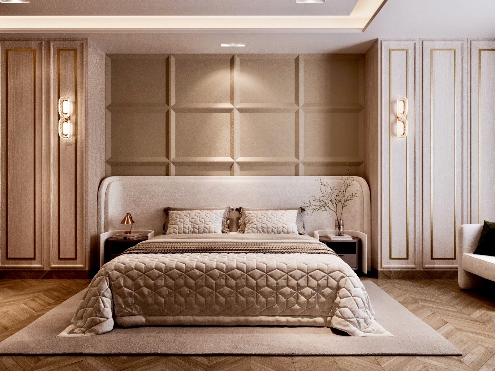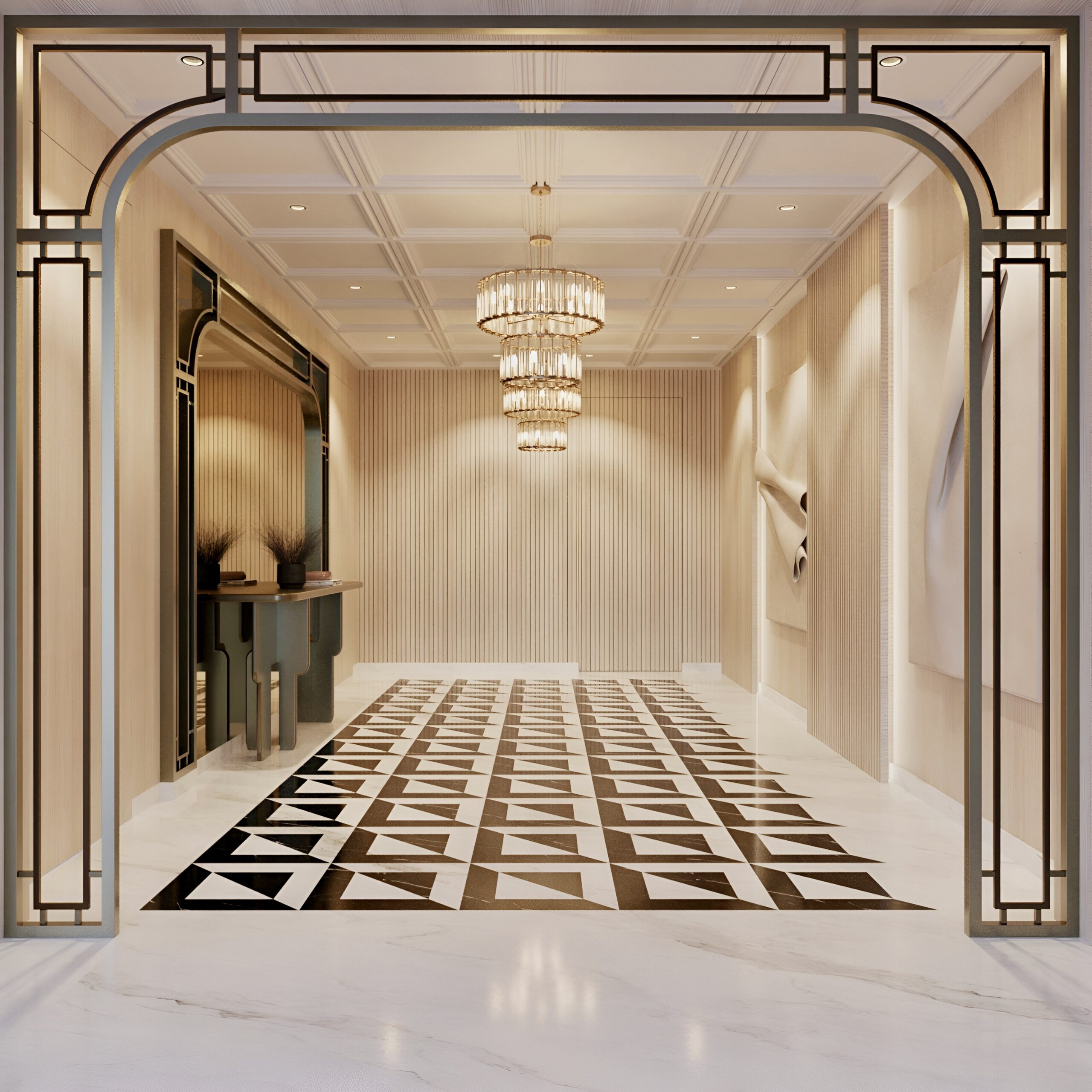 The project was a challenge in itself as it had to reflect the opulence the client needed in the existing structure. We played with flooring patterns, ceiling & furniture in major way to transform the space.